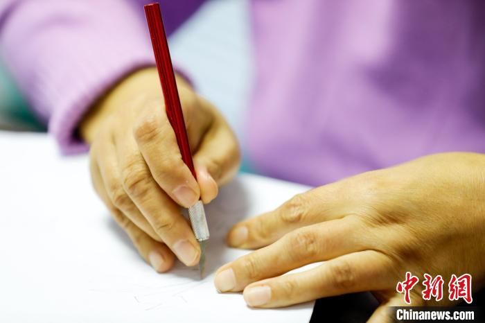 圖為河北省大廠民間刻紙藝人張翠梅正在創(chuàng)作冬奧主題刻紙作品?!⒘痢z