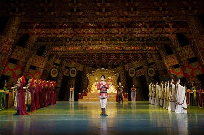舞劇《傳絲公主》以蠶絲為戲劇元素,以蠶桑女寧兒與于闐王子尉遲的愛(ài)情為外在線索,以盛唐時(shí)中原與西域的交流往來(lái)為隱伏線索,將凄美的愛(ài)情故事與壯闊的家國(guó)情懷交織在一起,引領(lǐng)觀眾穿越到大唐盛世,感受繁興的絲路文化和豐富多彩的民族風(fēng)情。