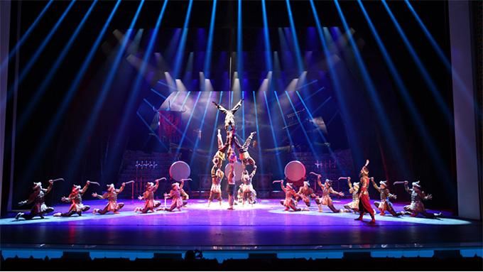 雜技是這部劇的一大亮點。新疆生產(chǎn)建設(shè)兵團雜技團近年來編創(chuàng)了《天鵝湖—男子倒立技巧》《向太陽—繩技》《春之韻—女子造型》等多個精品節(jié)目,并在國內(nèi)外重大雜技賽場多次獲獎。《樓蘭尋夢》中,主創(chuàng)團隊將這些獲獎節(jié)目進(jìn)行拆解,將蹬鼓、獨輪車、吊環(huán)、肩上芭蕾、水流星及舞中幡等雜技技巧與戲劇元素相融合,讓觀眾猶如置身于黃沙漫漫的絲路古國。