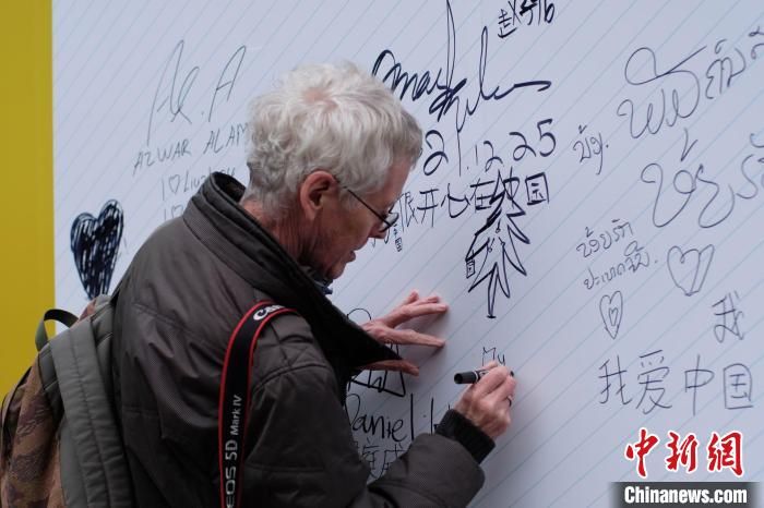一名外國友人參觀畫展,并簽名?!⒖÷?攝
