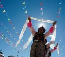 藏族自古崇尚白色,認(rèn)為白色是純潔、吉祥、誠摯、善良、正義和繁榮的象征。藏族崇尚白色由來已久,先民們把羊毛掛在門楣和各種器皿上;山口、要道的嘛呢石堆上放白色石頭;插箭祭“拉則”(山神的居所)時,在箭桿上系白色羊毛等等,無處不見白色崇拜的印記,藏族居住的青藏高原人們習(xí)慣稱做雪域,作為最常見的景物伴隨著民族漫長的歷史,白色更自然地進(jìn)入藏民族的審美觀念中,滲入藏民族的靈魂深處。