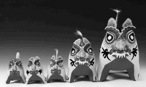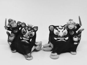 泥叫虎是山東高密的一種民間泥塑,起源于明代萬(wàn)歷初年,是形、色、聲、動(dòng)俱佳的民間工藝品,與撲灰年畫(huà)、剪紙并稱為“高密三絕”。泥叫虎腰部由牛皮連接,擠壓其頭部和尾部后,會(huì)發(fā)出響聲,叫虎一名由此而來(lái)。河南也有叫虎,又稱皮老虎。相較之下,山東的泥叫虎更具特色,而且在藝術(shù)風(fēng)格上更大氣,樣式憨態(tài)可掬,哨子發(fā)出的聲音也十分有趣。