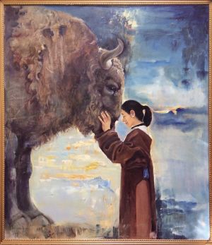 雍忠卓瑪?shù)膫€(gè)人畫展受到業(yè)內(nèi)外的諸多好評,也有觀眾專程從外地去拉薩觀展。展覽結(jié)束當(dāng)天,雍忠卓瑪特意和畫作《我和它》合影,并將合影發(fā)布在社交平臺(tái)上?!斑@是我與牦牛博物館結(jié)緣的作品?!彼蛴浾呓榻B。畫面上,穿著藏袍的少女閉著眼睛,用左手撫摸牦牛的面頰,額頭輕觸牦牛鼻尖,表情寧靜祥和。