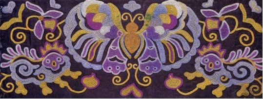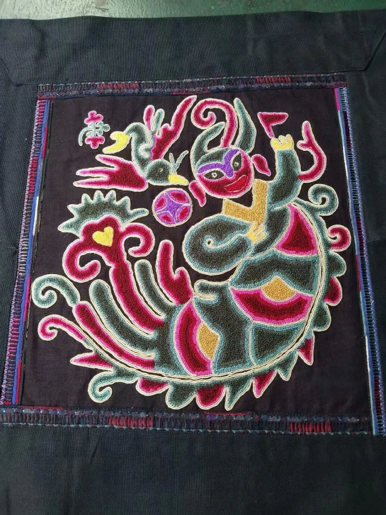 臺江苗繡的圖畫紋飾豐富,有造型獨特的飛禽走獸、花鳥魚蟲,還將人與大自然的其他動植物在繡片上融為一體,體現(xiàn)了苗族人民對自然萬物的崇拜,同時也折射出苗族屢經(jīng)遷徙的歷史變遷。