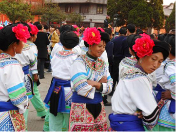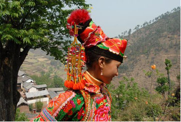 云南巍山彝族回族自治縣各民族如壯麗的織錦,將生活裝扮得五彩繽紛,充滿詩情畫意。其中特別是東山一帶的彝族服飾色彩較為豐富,款式變化多姿,并且以大量的銀制品和刺繡裝飾,制作工藝之精良,堪稱少數(shù)民族服飾一絕。以小孩帽而言,就有魚尾帽、小瓢帽、銀鼓帽、花帽和搭耳帽等數(shù)十種,名目繁多,式樣各異。帽子上都繡有花草、樹葉、龍鳳圖案,鑲嵌著閃亮的銀首飾,十分逗人喜愛。小孩的衣服式樣也很多,大多由紅、藍、綠、白幾種顏色的布料縫制而成,紅綠交織,藍白相襯,非常艷麗。如花朵一般的彝族少女通常頭戴銀鼓帽,墜耳環(huán)、身穿藍領褂,腰系花圍裙,下著綠彩褲,背掛圓裹背。銀鼓帽和繡花鞋做工極為精巧,全套裝飾花團錦簇,恰似一只開屏的孔雀。結婚后的婦女就不再戴帽子,改為結發(fā)髻,裹包頭。發(fā)髻一般呈寶塔狀,外裹黑紗和黑布包頭,發(fā)髻上戴“別子”?!皠e子”其實就是發(fā)卡,均為銀制品,分為四串,每串有兩個燈籠繡球,兩個響鈴和兩尾小魚。包頭巾外再用銀串珠、亮球飾之。上衣著右衽大襟,前短后長、領、袖及襟邊則鑲以多層不同的金銀絲瓣或自繡花紋的多層寬窄不同的花邊。外罩齊腰藍布短領褂,領口上安裝著七個用銀鼓釘湊成五個葉子,狀如葵花形,彝語叫“披巴”的裝飾。領褂四周皆用銀鼓釘鑲邊,共四排,每排36顆。一件領褂上需有兩百多顆銀鼓釘,加上胸前佩戴銀制的“三須”針筒,“菱角吊”串珠和雞心型繡花荷包,整個裝飾真是銀裝素裹,分外嬌嬈。腰間系的圍腰布上,鑲嵌多層金銀絲瓣或自繡圖案的花邊。圖案有串枝蓮、牡丹花、太陽花及鳳戲牡丹、丹鳳朝陽等。無論未婚和已婚婦女,背上都有一個用羊毛搟制而成的圓型繡花裹背,直徑約一尺不等,內(nèi)外兩層,中可承物,上繡兩對太陽花,一大一小,對稱排列。裹背除用作裝飾外,還可保護腰部,既有欣賞價值,又有實用價值,這在巍山彝族服飾中是最為典型的一件飾物。銀鼓帽繡有42朵小花,鑲有96顆銀鼓釘,帽頂插有花一朵或釘有櫻花一束。其帽形如金魚,魚頭魚身為帽,魚尾多岔分為護頸,亦稱為“魚尾帽”。繡花鞋呈船形或鳳頭形,鞋面繡有40余朵小花,紅色中夾有40余片綠葉。如果是新娘鞋,則用紅色或粉色的軟鍛做鞋面,更為講究。