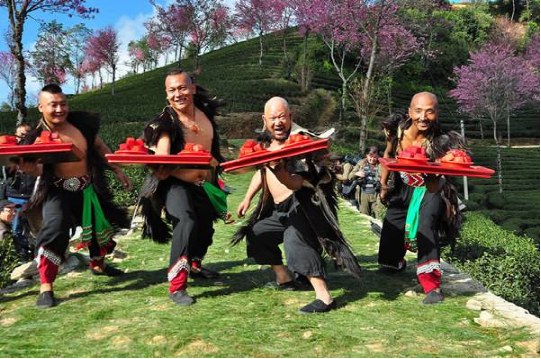南澗“彝族跳菜”主要有“宴席跳菜”和“舞臺跳菜”兩大類?!把缦恕币卜Q“席間跳菜”或“實地跳菜”,是當(dāng)?shù)匾妥迦罕娫诮Y(jié)婚慶典、新房落成、迎接貴賓、給老人祝壽等重大喜慶場合,宴請賓客,為增加喜慶氣氛而跳菜,講究“吃著并快樂著”。另一類是“舞臺跳菜”,根據(jù)表演地點或舞臺大小又分為“舞臺跳菜”和“廣場跳菜”?!拔枧_跳菜”即舞臺上表演的跳菜,演員通常在20人左右,舞蹈動作粗獷豪放、剛健有力,聲音高亢明亮。而“廣場跳菜”演員少則幾十人,多則可達幾百人,氣勢恢宏、整齊和諧。