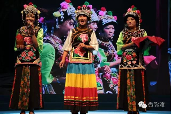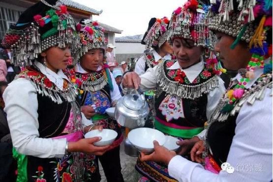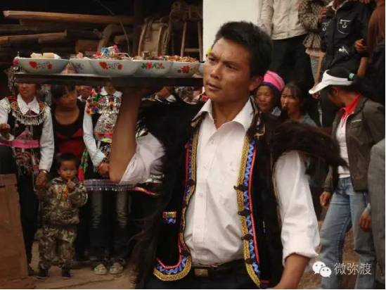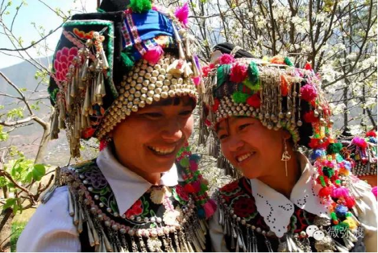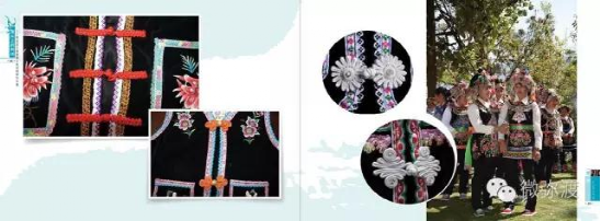 “羅羅潑支”男女服飾的特點(diǎn):“羅羅潑”男子服飾與“迷撒潑”相差無幾,一般不戴白頭巾。但是婦女的服飾相差卻很大,明顯保留著古樸高雅的南詔遺風(fēng)。頭飾由桂花、包頭、飄帶、大墜子、蜜蜂墜、芝麻鈴組成。桂花墊子在裱布上蒙黑色面料,中間訂有銀飾。包頭以黑色為主,長約2米,后鏈系于包頭,鏈子為銀制。飄帶長約4尺,黑色留花邊,兩頭訂英蘇。包頭還系有大墜子、蜜蜂墜各一對,芝麻鈴20個。領(lǐng)合由裱布黑色面料上訂芝麻玲20個圍在脖子上。圍腰的前胸部,由領(lǐng)口至腹部,左右各垂掛一條綴有串珠、針筒、響篾(口弦)一類飾品和生活用品的銀質(zhì)項(xiàng)鏈。人一走動,全身的小蘇鈴就響,聲音悅耳動聽,形象美觀大方。額頭前還圍有一塊翠綠色的“桂花綁”,綁上釘有銀質(zhì)小泡泡200多顆,羅羅潑支婦女的服飾彰顯華麗之美。