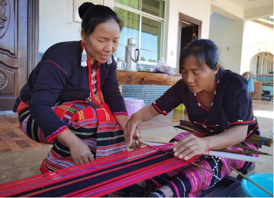 西盟縣翁嘎科鎮(zhèn)班弄村農家院子里,佤族老技藝手工織錦縣級傳承人娜龍正在教徒弟娜藥織布。