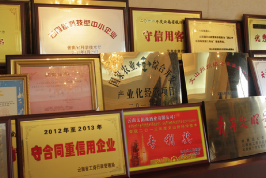 十幾年的風(fēng)雨兼程,太陽魂酒業(yè)有限公司榮膺多項殊榮,先后獲得“云南省農(nóng)業(yè)產(chǎn)業(yè)化省級龍頭企業(yè)”、“云南省農(nóng)產(chǎn)品加工重點企業(yè)”、“全國休閑農(nóng)業(yè)與鄉(xiāng)村旅游示范點”、“云南省著名商標”、“云南省省級企業(yè)技術(shù)中心”、“2009中國(昆明)酒業(yè)發(fā)展高峰論壇暨新中國60周年云南酒業(yè)十大功勛品牌”及“云南酒類消費市場十大最具成長性品牌”、“云南省接待用酒”等榮譽稱號。已獲得QS認證、ISO9001認證,HACCP認證等高標準企業(yè)資格證書。產(chǎn)品質(zhì)量達到國內(nèi)先進水平,釀制的“赤霞珠”葡萄酒獲2006年亞洲葡萄酒質(zhì)量大賽金獎、北京國際葡萄酒暨烈酒挑戰(zhàn)賽銅獎和第八屆中國國際葡萄酒及烈酒評酒會上榮獲銀獎,梅里圣地冰酒榮獲2006年亞洲葡萄酒大賽銀獎、2012年亞洲質(zhì)量大賽金獎及領(lǐng)袖產(chǎn)區(qū)代表產(chǎn)品。朗姆酒2011年榮獲“2011中國(蓬萊)國際葡萄酒?烈酒品評賽”銀獎。2011年國際釀酒師葡萄酒烈酒大賽中獲得銀獎,2012年獲得國際釀酒師葡萄酒烈酒大賽金獎。2012年,公司釀造的赤霞珠產(chǎn)品被法國勃艮第大學(xué)葡萄酒學(xué)院指定為教學(xué)用酒。2013年7月,“梅里圣地赤霞珠冰酒”榮獲2013中國優(yōu)質(zhì)葡萄酒挑戰(zhàn)賽金獎。同時,公司位于德欽產(chǎn)區(qū)的干紅及冰酒已通過有機產(chǎn)品認證。2014年“2012梅里冰酒”榮獲國際領(lǐng)袖產(chǎn)葡萄酒(中國)質(zhì)量大賽優(yōu)質(zhì)獎,拍品價格1萬元。