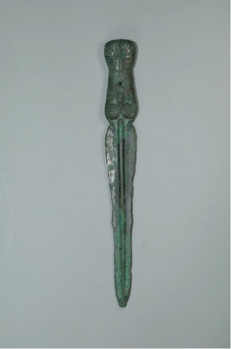 第四,夏家店上層文化中大量的游牧和騎馬民族文化因素,應(yīng)是晚商以來,伏爾加河流域的塞伊瑪文化經(jīng)南西伯利亞、外貝加爾地區(qū)的卡拉蘇克文化和塔加爾文化到達(dá)蒙古高原和中國(guó)北方長(zhǎng)城地帶,形成諸青銅文化,繼而進(jìn)一步向東方推進(jìn),抵達(dá)夏家店上層文化。其中受長(zhǎng)城地帶柄身連鑄匕首式短劍影響,形成夏家店上層的銎柄直刃劍,各種動(dòng)物雕塑形象也被吸收借鑒,在夏家店上層廣泛流行開來。