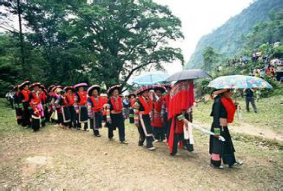 這里的"女婚男嫁"特點(diǎn),大體上有這么幾個(gè)階段。當(dāng)男女青年都長(zhǎng)到18歲后,就開(kāi)始講究修飾,喬裝打扮一新,女青年似花蕊朵朵,男青年個(gè)個(gè)英俊瀟灑。通過(guò)趕街、走親訪友、耍老表、節(jié)假日唱山歌,打陀螺,拋毽子等方式,進(jìn)行談情說(shuō)愛(ài),互相了解,這是認(rèn)識(shí)階段。在認(rèn)識(shí)基礎(chǔ)上,雙方互請(qǐng)到家做客,彼此進(jìn)一步掌握對(duì)方為人、性格,家庭成員,家庭經(jīng)濟(jì)等情況。這是加深認(rèn)識(shí)、了解、建立愛(ài)慕之情階段。每逢農(nóng)忙季節(jié)和節(jié)假日,女方總要請(qǐng)男方來(lái)幫助犁地、耙田,耕種,收割,蓋房子等,這是考察對(duì)方勤勞能干還是好逸惡勞階段,是最關(guān)鍵的階段經(jīng)過(guò)一兩年的交往接觸,雙方產(chǎn)生了深厚感情,女方就偷偷買布,精心地打好精致的布鞋送給男方,男方收到信物后,就選擇買手鐲、頭簪、戒指,耳環(huán)或手表等其中的一兩件送給女方,彼此作為定情物,確定自己的心上人。但是,這些交往仍然是在秘密的條件下進(jìn)行,屬保密階段。經(jīng)過(guò)以上四個(gè)階段以后,女方便請(qǐng)男方派老人帶上幾斤酒,糖,一些煙餅等禮品來(lái)訂親,要求上門,將婚事公布于眾,從這以后,女方就負(fù)責(zé)籌備一切嫁妝、床上用品、家具等。待東西備齊,女方就擇日接男方過(guò)門。
