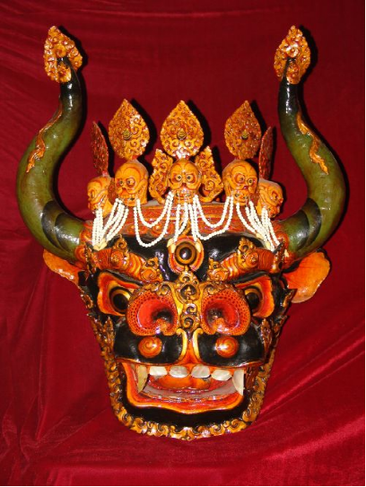 泥塑面具的制作也很有講究:“首先要將面具模型徹底風(fēng)干,然后在表面敷上摻有液體樹(shù)膠和面粉熬制而成的糨糊,再用一小塊布將風(fēng)干好的模子包好裹嚴(yán),接著要敷一層柴薪混合物,同樣用另一塊布把泥模包實(shí),反復(fù)四五次后,將模子放好讓它自然干透。這些步驟做完后,要用一根棍子敲打出包在里面的泥模,這樣就形成了布、樹(shù)、膠和面粉做成的一種面具。當(dāng)然,做好后還要進(jìn)行彩繪、涂清漆,這樣才能讓一個(gè)面具光彩奪目。”邊巴說(shuō)道。