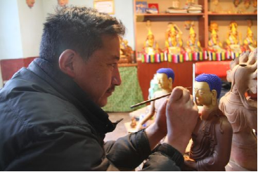 在普布次仁所在的公司里,有一個(gè)專(zhuān)門(mén)用來(lái)制作泥塑面具的房子,從外表上看去,它只是一個(gè)普普通通的藏式民居,但走進(jìn)其中,則別有一番天地。在房間里整齊擺放了大大小小的泥塑面具、佛像,這些手工藝品造型生動(dòng),每一件手工藝品仿佛都在訴說(shuō)著一個(gè)古老、動(dòng)人的故事。