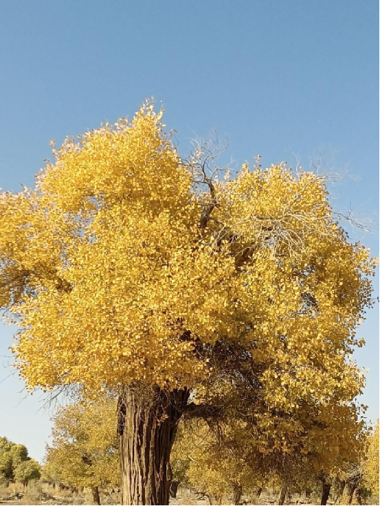 每當(dāng)深秋季節(jié),胡楊樹葉變得一片金黃,形成胡楊秋色,樹影婆娑,奇妙絕倫,賞心悅目。漫步在濃郁的胡楊林中仿佛進(jìn)入神話般的仙境。茂密的胡楊千奇百怪,神態(tài)萬(wàn)般。粗壯的幾人難以合抱,挺拔的七、八丈之高,怪異的似蒼龍騰越,似虬蟠狂舞,令人驚奇不已,嘆為觀止。僅就密密匝匝的樹葉,也是風(fēng)采獨(dú)有。幼小的胡楊,葉片狹長(zhǎng)而細(xì)小,宛若少女嫵媚的柳眉,人們常常把它誤認(rèn)為柳樹;壯齡的胡楊,葉片又變成卵形、闊卵形或三角形,猶如興安嶺的白樺;進(jìn)入老年期的胡楊,葉片才定型為橢圓形。更令人稱奇者,在同一棵胡楊樹冠的上下層次,還長(zhǎng)著不同形狀的葉片,因此,又稱“異葉楊”