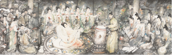 劍器舞也有著悠久傳統(tǒng),早在春秋戰(zhàn)國時代,孔子的學生子路,戎裝見孔子,曾拔劍起舞。學生拜見老師舞劍,當然只是表演技藝,是對老師致敬的意思。湖北隨縣戰(zhàn)國初期曾侯乙墓出土的鴛鴦盒上的樂舞圖案中,鼓旁的舞者腰間掛著短劍,說明劍舞可能是當時頗為流行的一種舞蹈形式。楚漢相爭時,劉邦、項羽宴于鴻門,項莊說:“君王與沛公飲,軍中無以為樂,請以劍舞?!表椨鸨硎就猓谑琼椙f拔劍起舞,逐漸靠近劉邦,企圖借機殺死劉邦,在場的項伯見劉邦危急,也以劍伴舞,保護劉邦不被項莊殺害。這個故事表明,當時筵宴中有舞劍作為助興表演的風俗。唐代,杜甫作《故武衛(wèi)將軍挽歌三首》,有“舞劍過人絕”句。可見當時許多人會舞劍,而且各有絕招。公孫大娘最為擅長的《劍器舞》,是《裴將軍滿堂勢》。杜甫曾觀其舞,并寫了《觀公孫大娘弟子舞劍器行》一詩,觀者如山,可見此舞技巧之高。