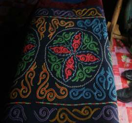 科爾沁刺繡與漢民族刺繡所用底料相比,有自己的特色。漢民族女性喜歡在布料或綢緞上刺繡,特別喜歡軟底的材料。而科爾沁的蒙古族繡女,其刺繡選料更廣一點(diǎn),除去在軟底料上刺繡外,她們還可以在羊毛氈、皮靴等硬面料上刺繡。在這些硬底料上刺繡,是很費(fèi)力的,所用的“繡線”也不一般。漢地和南方的刺繡,多用絲線、紗線,金線、銀線、棉線和絨線,為的是色彩豐富,光澤度好,手感也柔軟,不起毛不褪色??茽柷叩拿晒抛宓睦C娘們,用駝絨線、馬鬃或牛筋線等材料,用這些草原上的特殊“繡線”在硬底料(如駝鞍、馬鞍等)上刺繡出的圖案,質(zhì)感極強(qiáng),猶如浮雕。