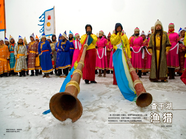 據(jù)記載,一千年前的遼金時期,這里就是天然的漁獵之地。傳說遼帝圣宗喜吃“冰魚”,每年臘月,便率領家眷浩浩蕩蕩來到冰凍的查干湖上扎營。遼帝在行宮中接見大宋使臣,商談國家大事,會見部落首領,命令仆人將帳篷里的冰層刮薄,直至薄如紙片,冰下游動的魚清晰可見。吃飯時,便將薄冰輕輕擊破,水中鮮活的魚兒會急不可待地跳出冰面,歷史上 把這種捕魚方式叫“春捺缽”。