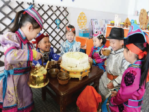 走進(jìn)錫林郭勒盟鑲黃旗民族幼兒園,“賽白努,請坐、喝茶”等文明禮貌用語讓我們聽得無比親切。該幼兒園2009年開始開展“傳承蒙古族文化遺產(chǎn)”的課程。據(jù)了解,課程的內(nèi)容按照日常生活的習(xí)慣來展開故事情節(jié)。舞蹈、繪畫,都從幼兒的角度去設(shè)計(jì),結(jié)合幼兒喜歡的童話故事、卡通圖片,將蒙古族文化滲透其中。課外要求家長帶領(lǐng)孩子走進(jìn)牧區(qū)參加放牧、擠奶、接羔等勞動(dòng),從長輩那里學(xué)習(xí)繼承生產(chǎn)生活方式和技能。蒙古象棋、“吉日格”(鹿連兒)、“沙嘎”(羊拐子)等一些蒙古族傳統(tǒng)游戲不僅是智慧、意志和應(yīng)變能力的較量,更重要的是使民族的文化遺產(chǎn)得以傳承。