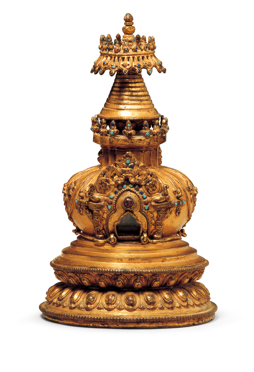 青海一些牧區(qū),天葬日凌晨,死者最小的兒子將尸體抱出帳蓬,人們把已經(jīng)捆好的尸體和一個(gè)裝滿土石的口袋連接起來搭在牛背上,或由天葬師背尸體到火葬場(chǎng),送葬者不能回頭、不能喧嘩、不能停步。到天葬臺(tái)后,除留一個(gè)非親屬的老人外,其余人全部撤離,然后天葬師將尸體肢解喂禿鷲。如果禿鷲將碎尸吃干凈,意味著死者生前行善積德,其靈魂已升天,如果禿鷲沒吃干凈,說明死者生前有罪孽,家人要給寺院布施,請(qǐng)求寺院僧人再做法事,以贖死者罪惡,讓靈魂早日升天(圖為鎏金紫銅舍得塔)。