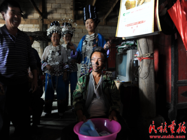 姑娘出嫁必須有娘家人陪送,婚禮這一天清早,“新娘”便在“接親客”的帶領(lǐng)和送親隊伍的陪同下,一路歡聲笑語 ,浩浩蕩蕩向“新郎”家走來。走到新郎家村邊,有的燃放鞭炮,一直燃放到新郎家門口,請新郎父母出來開門;無鞭炮準(zhǔn)備的,則在寨邊稍候,由迎親伙伴飛報新郎家做好迎親的準(zhǔn)備。男方父母聽到后,多數(shù)是很高興地喊醒家中兒女,由新郎的妹妹或堂姐妹為迎親主體,加上寨上的姐妹和房族組成迎親隊伍,打開大門,把新娘迎進(jìn)家來。接親的主要儀式是接傘。接傘的人必須是新郎的小妹或堂妹。無親妹、堂妹者則由新郎父母指定一與新郎同輩份的小姑娘去接。新娘走至大門,即由新郎的妹妹跨出門外迎接新嫂子,新嫂子接著用左手把雨傘遞給接傘的妹妹,接傘妹妹接過新嫂子手中的雨傘后,新娘即用左腳跨進(jìn)屋內(nèi),以示今后成為新家庭的主婦。隨即由接傘妹妹攜新娘手迎入新房,迎親婦女們陸續(xù)進(jìn)入新房休息。入門后,新郎家的“陪娘”及姑娘們便熱情地安排“送親客”團(tuán)團(tuán)圍坐,并簇?fù)碇靶履铩本o靠堂屋中柱子就坐,意為“新娘”從此當(dāng)家立業(yè),將來就像中柱子一樣,頂大梁,撐起這個家。