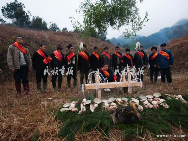 到招龍儀式活動(dòng)點(diǎn)時(shí),已是凌晨五點(diǎn)半,我們所在的位置是一個(gè)山腰,有一個(gè)小壩子。我發(fā)現(xiàn)參加儀式的只有十二三個(gè)人,就好奇地問:“為什么只來十多個(gè)人?”原來這些人是選出來的代表,該村有7個(gè)村民小組,共203戶,有980多人口,每次招龍大喜時(shí),要從村民中推選出12位作為招龍代表,從頭到尾主持一切事務(wù)。說話間,村里人就開始忙著生火,或準(zhǔn)備各項(xiàng)招龍工作。他們用木板支起一個(gè)擺放祭品的臺(tái)板,擺上祭品。接著,在招龍師傅的主持下,儀式正式開始。第一個(gè)程序是“喊白虎龍”,苗家稱為“共階夸羊捌”,師傅拿著一個(gè)白公雞,進(jìn)行一番念誦后宰殺掉,等雞煮熟后再擺上祭臺(tái)。