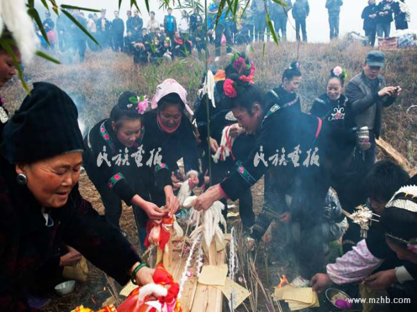 祭祀現(xiàn)場(chǎng)穿著盛裝的姑娘跟著歡樂的蘆笙起舞