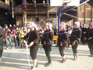 據(jù)當?shù)卣辖榻B,毛坪村過苗年跳蘆笙,歷來都是光腳跳。寨老茍吳說,光腳板跳,才接地氣,才能碰觸到列祖列宗的靈魂,與祖先共舞。傳統(tǒng)蘆笙舞跳完,當?shù)貗D女還要舉行“大女子主義”舞蹈表演。這種舞蹈,最大特征就是婦女們把男性的一面以夸張的手法表現(xiàn)出來。領(lǐng)隊的婦女要口叼長煙斗,臉畫長胡子,左腳光腳丫,右腳穿鞋,邊走邊舞,滑稽無比。隊后的婦女,雙腳不能穿同樣的鞋,嘴叼香煙,“裝模作樣”,妙趣橫生。這種滑稽舞蹈,引來全寨村民和賓客歡笑,整個村寨其樂融融。
