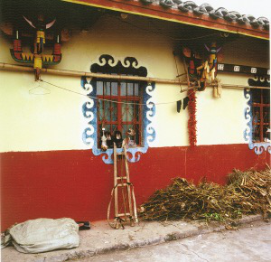 四川昭覺彝民民居獨(dú)有的牛頭裝飾。最能展現(xiàn)彝族建筑特色的要數(shù)前屋檐的挑拱了。屋檐的裝飾在建房時(shí)從墻上穿枋垂柱形成,少則3層,多則5層,上層垂柱上雕成牛角形托起屋檐的橫梁,下層垂柱上雕有形象逼真的裝飾牛角,垂柱的卡槽為牛蹄形、馬牙形,蹄尖向內(nèi),以示招財(cái)進(jìn)寶。穿枋向上彎曲,與垂柱的牛蹄呼應(yīng),傳統(tǒng)的穿枋雕刻日月星辰、飛禽走獸和條形圖案。