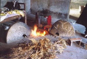 涼山彝族獨(dú)特的“鍋莊石” 。彝族的火塘為全家的生活中心,進(jìn)食、取暖、照明、會客、議事等都圍著火塘進(jìn)行?!板伹f”由3塊石頭支撐,一般在房屋建成前就請石匠打造好鍋莊石。其石料選取沒有污垢而又無缺陷的青石,鑿成厚10厘米左右的變異扇形,上面刻有龍、火、日、月、魚、鳳等古樸傳神的浮雕圖案。日常生活中,一般在鍋莊“上方”(火塘里側(cè)至墻壁)設(shè)矮床。