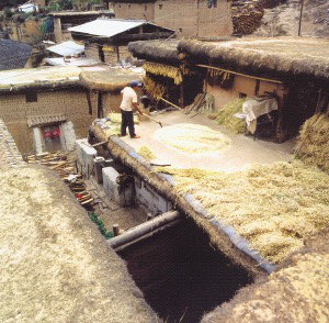 土掌房屋頂 云南楚雄地區(qū)的土掌房,是土墻、土頂、外墻和底層無窗的兩層樓房。有的內(nèi)院也蓋屋頂,稱“無內(nèi)院式”。設(shè)天窗采光,屋頂還能當(dāng)曬臺。整個(gè)村落沿山坡而建,巷道很窄,遠(yuǎn)遠(yuǎn)望去,你家的屋頂是他家的院壩,只要上了一家屋頂,就能靠活動的木梯自由往來。