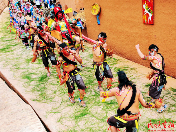 恭請(qǐng)大啞巴的儀式上,羅支全部到齊。羅支就是眾老啞巴,為首的被稱(chēng)為畢摩。彩繪時(shí),以不同的圖案分別繪在臉部的右上方作為家族和輩分區(qū)別。儀式上,六位畢摩在護(hù)衛(wèi)總管的護(hù)衛(wèi)下,依次點(diǎn)香叩首。畢摩大聲喊“請(qǐng)啞巴出山嘍”。然后四個(gè)壯實(shí)的中啞巴用扎好的彩轎抬著大啞巴游街,其余啞巴打歌跟在后面。最為活躍的是畢摩的跟幫,也稱(chēng)為“馬彷”,他們以倒退的方式,邊跳邊引導(dǎo)行進(jìn)的隊(duì)伍。啞巴隊(duì)從村頭到村尾,通過(guò)祭拜龍樹(shù)、祭鼓,經(jīng)過(guò)“三請(qǐng)三唱三起號(hào)”,將大啞巴請(qǐng)到廣場(chǎng),隨后開(kāi)始了具有濃厚文化底蘊(yùn)的啞巴舞表演。