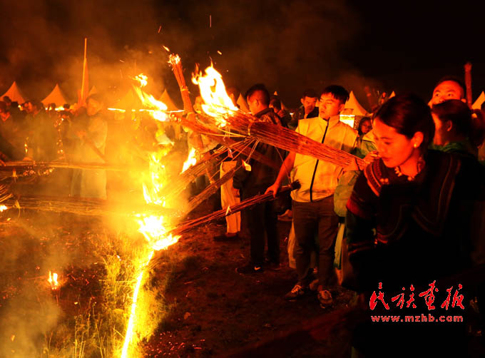 在昭覺縣谷克德涼山彝族傳統(tǒng)火把節(jié)上點(diǎn)燃火把的人們