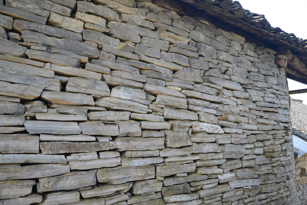 石板房以石條或石塊砌墻,墻可壘至5至6米高;以石板蓋頂,風(fēng)雨不透。總之,除檁條、椽子是木料外,其余全是石料,甚至家用的桌、凳、灶、缽都是石頭鑿的。一切都樸實(shí)無華,固若金湯。這種房屋冬暖夏涼,防潮放火,相對采光較差。