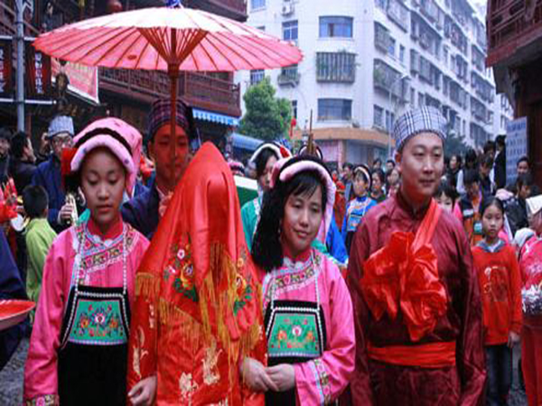 男方的“提親”得到應(yīng)允以后,雙方即開始頻繁往來,加深感情。到了可以談婚論嫁的年齡,便舉行“訂親”儀式。由男方選擇吉日,通知女方做好準備。那一天,男方家請人抬著用大紅紙封口的一大壇酒、若干塊紅糖、一盤用紅紙包裝的爆竹、一只大公雞,另外還要送彩禮錢若干,其數(shù)量不同時代、不同地區(qū)有不同的慣例。訂婚儀式后,準女婿每年給岳父家送一只豬腿、糯米粑及酒等禮物,以示孝敬。