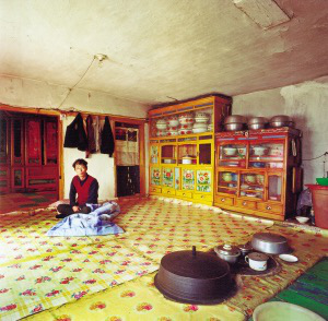 朝鮮族傳統(tǒng)住房不論什么結(jié)構(gòu),都是滿屋炕。進(jìn)屋脫鞋,席炕而坐是他們的習(xí)慣。房門的門檻很高,進(jìn)門是一塊一二平方米大小的屋地,接著是凹下去1米左右的燒火坑,里面是灶膛,放燒柴,平時蓋著木板,或添足燒柴坐在上面炊事。這樣,蓋板、灶臺、炕面在同一平面,像延伸了的火炕,既干凈又防火。因房屋較矮,又有大面積的火炕,加上明亮的玻璃窗,在