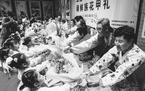 “花甲宴”非常隆重。壽宴當(dāng)日,花甲老人由兒女為其換上嶄新的民族服裝,在洞簫、伽倻琴的伴奏聲中,端坐在壽席中央,接受晚輩們的跪拜大禮。按照傳統(tǒng),花甲老人身后要擺放繪有松鶴圖的屏風(fēng),取長壽之意。屏風(fēng)兩側(cè)手書對(duì)聯(lián)“父親的恩情比山高,母親的大愛比海深”,橫批是“某某花甲壽宴”。