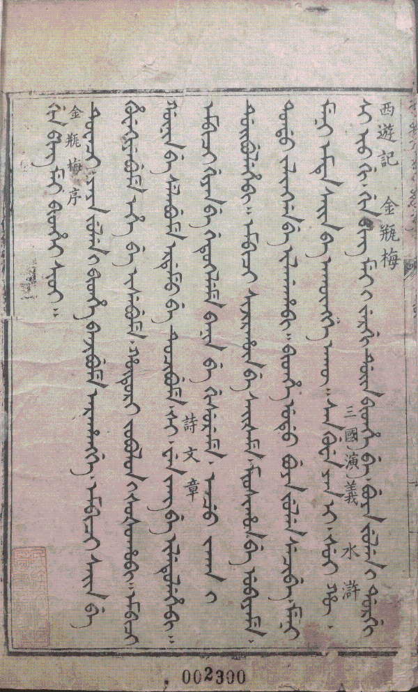 滿文本《金瓶梅》國(guó)內(nèi)藏有國(guó)家圖書(shū)館刊本、中央民族大學(xué)圖書(shū)館刊本、趙則誠(chéng)先生藏刊本(殘)、中國(guó)社科院民族研究所刊本(殘)、大連圖書(shū)館抄本、吉林大學(xué)圖書(shū)館精抄本、中國(guó)民族圖書(shū)館刻本等。此外北平闞君云敝處所藏有蒙文《金瓶梅》。