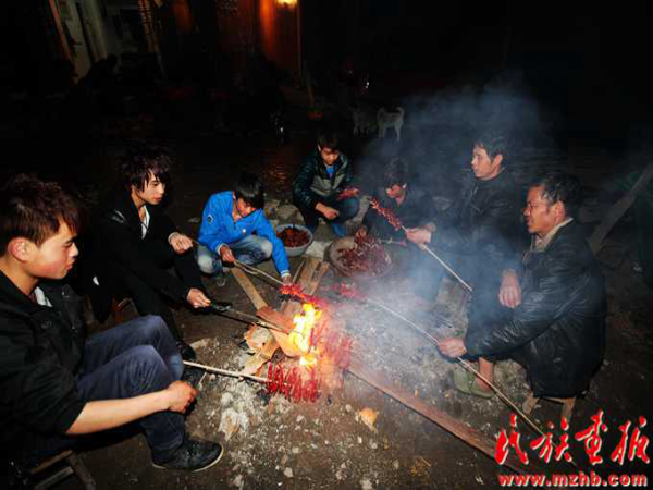 第一天的婚宴在上午11時(shí)左右開(kāi)始,來(lái)參加婚禮的客人都要帶上彩禮,臨近主人家門(mén)時(shí)還要燃放鞭炮,主人則熱情相迎。彩禮主要包括稻谷、米酒、土布和數(shù)量不等的人民幣,人民幣有單獨(dú)給的也有和實(shí)物放在一起給的。主人對(duì)客人送的彩禮要及時(shí)登記造冊(cè),以便婚宴結(jié)束后要給送實(shí)物彩禮的客人還禮?;檠绲牡攸c(diǎn)均設(shè)在房前屋后的院子里、馬路邊或臨近鼓樓的廣場(chǎng)上,一般都有十多桌。桌上的菜肴除了紅肉、燉肉和烤肉外,還有各種酸菜及炒菜等,共有十來(lái)個(gè),主食是小黃當(dāng)?shù)刈援a(chǎn)的糯米飯,酒水則以自家釀制的米酒為主?;檠玳_(kāi)始,人們邊品嘗豐盛的菜肴邊開(kāi)懷暢飲,主人不停地為客人敬酒添菜。特別值得一提的是,在侗族婚宴上新娘不出來(lái)敬酒;人們飲酒時(shí)也比較文明,沒(méi)有過(guò)分勸酒現(xiàn)象;還有就是對(duì)老年人格外尊敬:寨老們要專(zhuān)門(mén)設(shè)一桌,并且坐在上席,屆時(shí)這些寨老們還要穿上漂亮的民族服裝,纏上頭帕,成為婚禮上另一道靚麗風(fēng)景線(xiàn)。