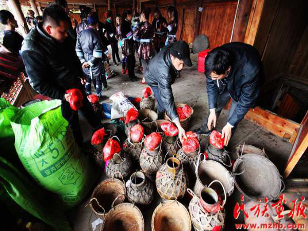 這次結(jié)婚的共有15對(duì)新人(多時(shí)有二三十對(duì)),均來(lái)自本寨的青年男女?;槎Y從大年二十六開(kāi)始,共進(jìn)行三天,在三天的婚禮中新郎新娘家均有婚宴,尤以第一天中午的規(guī)模最大也最為隆重。