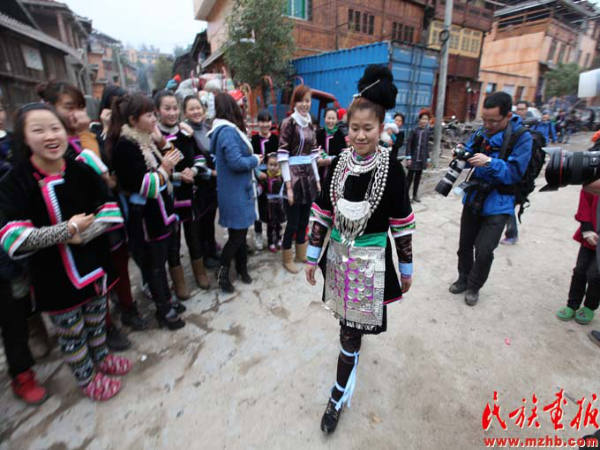 新娘走秀和鬼師做法是婚禮儀式的一項(xiàng)主要內(nèi)容。新娘走秀在第一天上午九時(shí)舉行,這是新娘唯一向眾人展示自己的機(jī)會(huì)也是婚禮中最為隆重的儀式,這時(shí)街心廣場(chǎng)及道路兩側(cè)擠滿(mǎn)了看熱鬧的群眾。之前新娘們都要精心打扮一番,穿上嶄新漂亮的傳統(tǒng)衣裙,戴上各種銀飾,然后在親人的目送下離開(kāi)家門(mén)。新娘走秀與漢族結(jié)婚的迎親有很大不同,沒(méi)有新郎伴娘的陪伴,更沒(méi)有車(chē)水馬龍的迎親隊(duì)伍,只是一人獨(dú)身前行。鬼師做法在新娘登場(chǎng)后進(jìn)行,我們只是見(jiàn)到了鬼師做法后留下的一些物品。