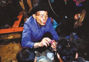 這天,我們剛好在縣里采訪,聽說高良鄉(xiāng)瑤族村寨要舉行度戒活動,于是就直奔瑤寨而去。一進(jìn)寨子,馬上感覺氣氛不同?,幾鍕D女們頭戴別致的大銀盤,身著盛裝,真像過節(jié)一樣。經(jīng)了解后,得知寨子里共有十幾個男孩要參加這次度戒。寨子里的一位老人告訴我們,一般情況下,只是兩三人,這樣多的男孩一同舉行度戒儀式是很難碰到的??磥?,我們的運氣還真不錯。我們來到度戒地點,見到將要度戒的十幾個男孩集中在一起,用棉被蒙著頭,不能見陽光,要等儀式完后,才能見陽光。