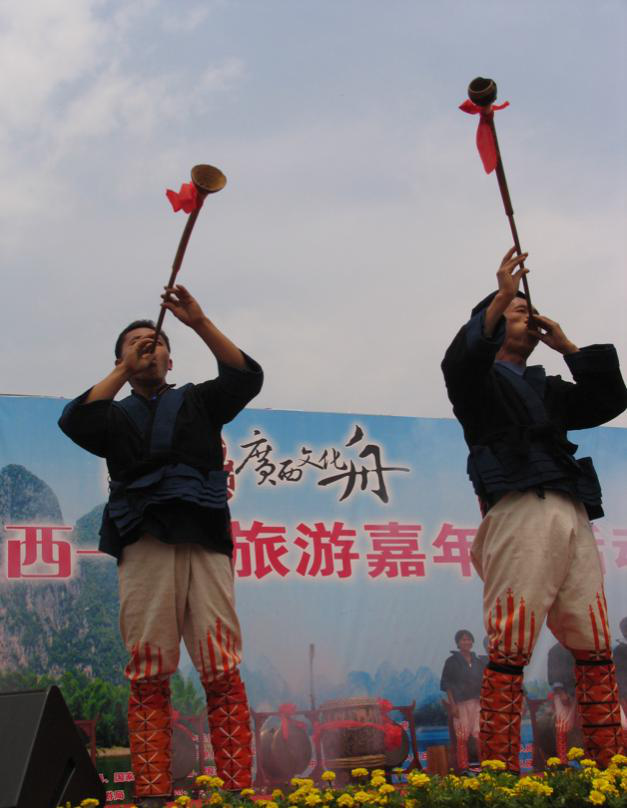 民間娛樂和日常祭祀用的樂器,有長鼓(黃泥鼓)、銅鼓、嗩吶、洞簫、笛子、銅鈴、簡板、長號、牛角、銅鑼和皮鼓等。長鼓、牛角、竹笛等樂器,在宋代的樂器中,已廣泛采用,是十分動聽的一種樂奏。牛角,是瑤族特有的古老樂器,演奏時用以伴奏,其聲“鳴鳴”然,遠近無不聽聞。長號、銅鑼、鈸、二胡等樂器是外族傳入瑤區(qū)的,他們除了吸取外族演奏的技藝之外,根據(jù)自己的民族特點,增添了不少的本民族生活色彩,演奏技巧更為高超,深受群眾歡迎。