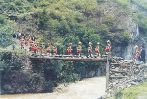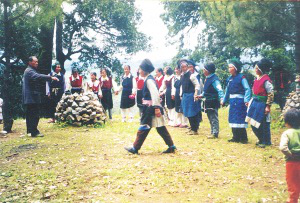 頌藥仙活動(dòng)各村為陣,是一項(xiàng)以傳授藥物知識(shí)和防病方法為主題的歌舞活動(dòng)。早早吃過晚飯后,人們集中到白天洗揀藥物的水邊,用青松和花草編扎的轎子抬上藥仙的肖像,敲鑼打鼓、載歌載舞,把藥仙抬到她的化身“定居”的山林中,舉行頌贊藥仙功績(jī)的儀式?;顒?dòng)場(chǎng)地四周,插遍各種花枝,花枝上掛滿姑娘們精繡的荷包,荷包中裝的是各種治病的藥粉。場(chǎng)中央燃燒著熊熊篝火,火邊供著藥仙的肖像。參加活動(dòng)的人,各持兩束用藥用植物編成的“花束”,在歌頭的帶領(lǐng)下,眾人手舞“花束”,環(huán)篝火踏歌而舞。用動(dòng)聽的歌聲,歌唱藥仙嘗百草、治疾病的故事;介紹用中草藥防病、治病的知識(shí)……踏歌接近尾聲時(shí),人們便把手中舞耍的“花束”丟進(jìn)篝火中焚燒,象征把各自身上的病疾丟盡,實(shí)際上是借焚藥草來達(dá)到消毒防病的目的。