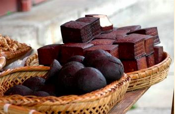 逢年過節(jié)或來了至親好友、土家人的餐桌上往往會(huì)擺上一碗血豆腐。血豆腐是土家族傳統(tǒng)菜。用新鮮的豆腐加上干凈的豬血,拌以食鹽、辣椒、花椒、桔皮、肥肉末,用手捏成塊狀,放在柴草煙上熏烤,以表面稍黑,內(nèi)質(zhì)稍硬為度。食用時(shí)可以切成薄片,加以豬肉爆炒,也可以切成細(xì)絲,加上辣椒、香蔥炒制。入口時(shí),令人覺得清香酥軟,大開胃口,是一道下酒佐食的佳肴。
