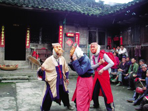 土家族陽戲在貴州、湖南、重慶等省、市都有流傳,湖南省張家界陽戲和重慶酉陽陽戲均被列入了省級非物質(zhì)文化遺產(chǎn)名錄,得到保護和重視。貴州沿河土家族自治縣的土家族陽戲同樣古樸而充滿風(fēng)韻,5月19日,當(dāng)?shù)氐囊慌幕ぷ髡邤M通過挖掘整理,把獨具地方特色的面具陽戲申報為省級非物質(zhì)文化遺產(chǎn),希望沿河陽戲同樣受到重視和保護。