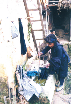 紡紗、織布、藍(lán)染,是哈尼族婦女制作服裝的重要組成部分。她們在織布前要做的準(zhǔn)備工作,就是操動制線機(jī),把一根根短小的線連接起來,捲在小木棍上,然后操動絞線機(jī),把線棍上的線分開絞在木梭子和木輪子上。接著是分線,人數(shù)不限,但不能少于5人,一般10米為一組線??棽紩r(shí),在織布機(jī)上方搭起兩排密集的線網(wǎng),當(dāng)雙腳踩動踏板時(shí),兩排線網(wǎng)一上一下地交叉移動,將拖著線的梭子一次次地左右穿梭于線網(wǎng)中。這樣重復(fù)地進(jìn)行,就織出一筒筒布,一般10米為一筒布。最后把織成的布放入靛缸里泡洗,曬干后就可以制作服裝了。
