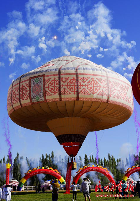氈房是哈薩克族的傳統(tǒng)民居之一,是哈薩克族人游牧?xí)r居住的地方。圖中直徑長(zhǎng)達(dá)21米、高23米、體積達(dá)2800立方米、通過世界紀(jì)錄協(xié)會(huì)認(rèn)證的這只阿克塞縣的旅游空中形象大使,是目前世上最大的哈薩克族氈房熱氣球