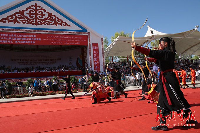 射箭是游牧民族在過去的游牧生活中必會(huì)的生存本領(lǐng)之一,哈薩克族的射箭也是傳統(tǒng)的體育競(jìng)技項(xiàng)目。圖為阿克塞之鷹2017年絲綢之路騎射國際大學(xué)生邀請(qǐng)賽上,學(xué)生的射箭展示