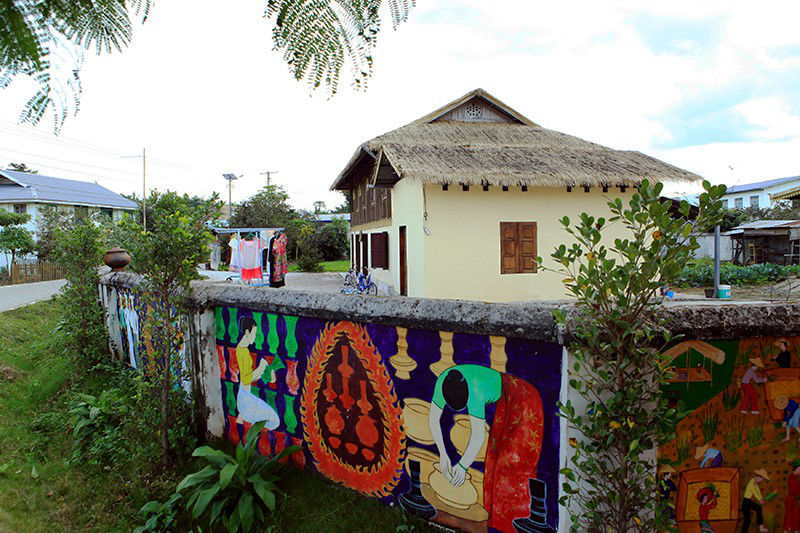 吞也指著家里客廳墻上的畫對我說:“畫中描繪的是我記憶中的故鄉(xiāng),一些古老的生活環(huán)境和生產(chǎn)方式,我想將這些逝去的生活記錄下來?!眽ι蠏熘牟粌H有吞也的畫作,還有一些瑞麗其他農(nóng)民畫師、畫家們的作品。2011年,在文化惠民政策和鄉(xiāng)村旅游開發(fā)的帶動下,瑞麗市在喊沙寨設(shè)立了農(nóng)民畫展室,目的是給農(nóng)民畫營造一個原生態(tài)的展示環(huán)境。