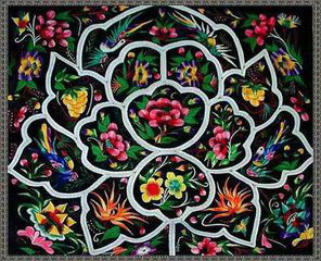 傣錦按構(gòu)成形式和材料可分為兩大類(lèi):一是以西雙版納為代表的傣錦;二是以德宏為代表的傣錦。兩類(lèi)傣錦在紋樣構(gòu)成、色彩處理和植物材料上均有很大不同。 西雙版納傣錦以白底為主,上織黑、紅花紋,色彩明快,整體效果突出。深底的色彩織錦較少。尤其喜歡采用帶狀紋樣。帶狀紋樣疏密有序,每條紋樣內(nèi)容形式又有變化。西雙版納傣錦經(jīng)線、緯線均為棉線,通經(jīng)通緯織花。德宏位錦是以棋格紋為基本骨架的四方連續(xù)圖案,棋格內(nèi)嵌以四瓣花、萬(wàn)字紋、象鼻紋、象足紋、八角花等經(jīng)過(guò)幾何化的抽象紋祥:色彩濃重沉艷,常以高飽和度的色彩組成強(qiáng)烈對(duì)比色調(diào),有的以黑色為底,還夾織金、銀線。織物材料為經(jīng)棉緯絲,編織工藝既有通經(jīng)織花,又有通經(jīng)斷緯織花,采用高臺(tái)織機(jī)編織。四方連續(xù)圖案沒(méi)有明確的方向,便于多種用途,如床褥、被面、統(tǒng)帕等。